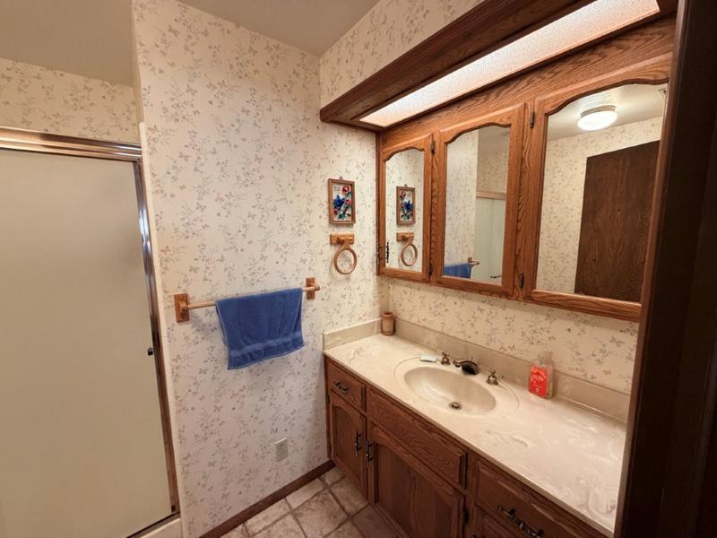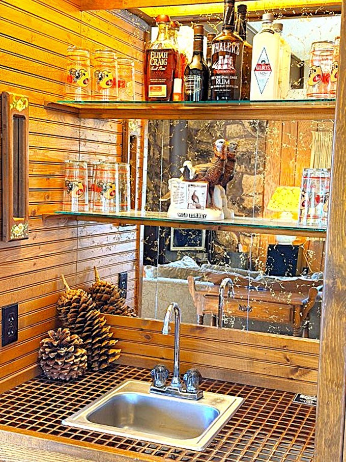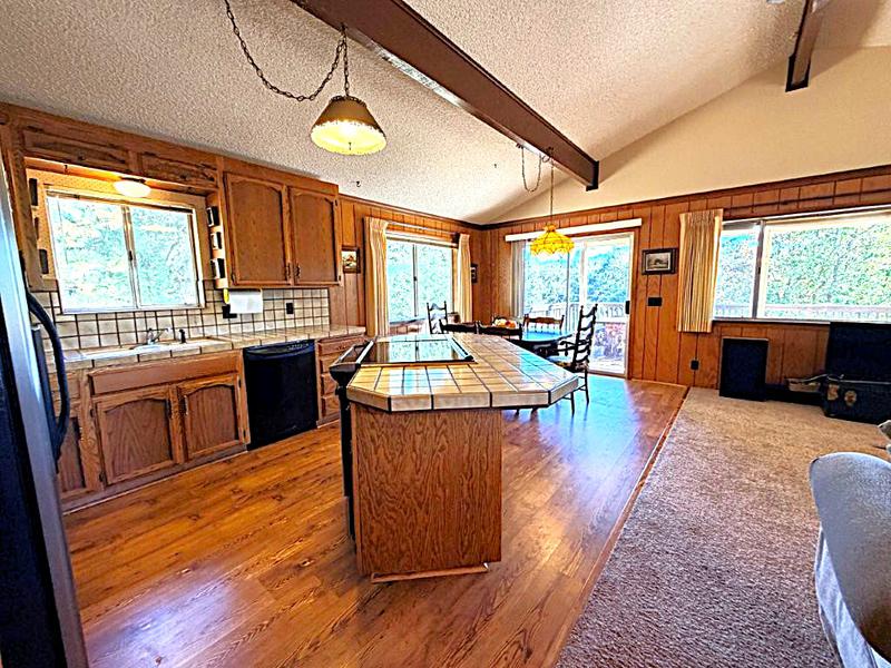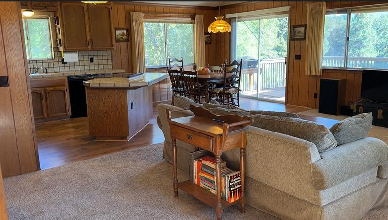 One level, easily accessed from top of driveway, with covered parking under front deck. Additional graveled parking area next to car port. Great room concept, wet bar, dining area, wood stove for heat and ambiance, with sliding glass doors leading to covered front deck for outdoor relaxing and dining enjoyment. Great room has wood beams on a vaulted ceiling and rich wood paneling giving this home a cabin feel. Eazy to care for wood laminate flooring in kitchen and dining area. Two bedrooms and baths are down a shot hall with the laundry located in the hall.
